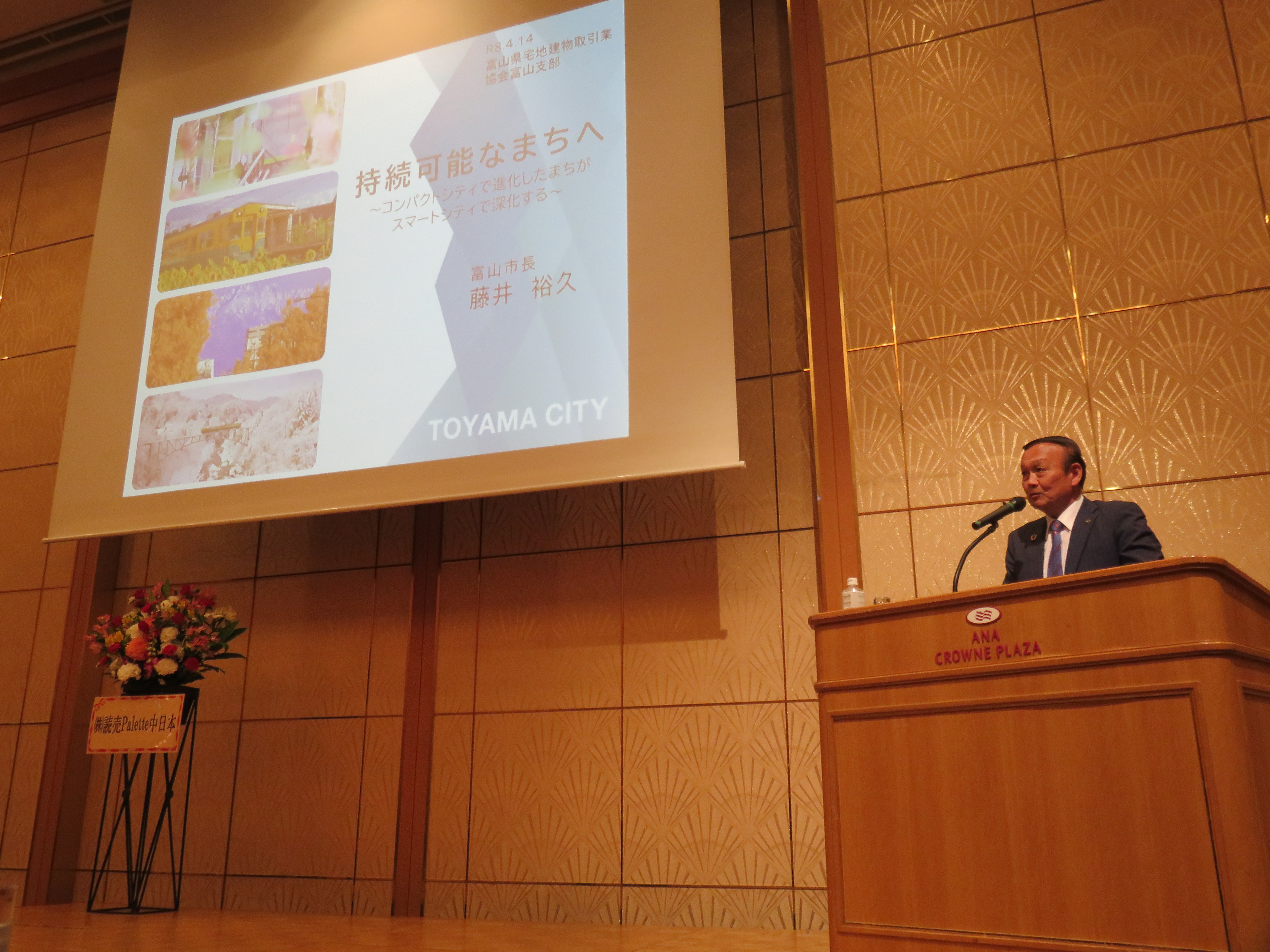 報告会の後には、富山市長 藤井裕久様をお招きし、「持続可能なまちへ~コンパクトシティで進化したまちがスマートシティで深化する~」と題してご講演いただきました。