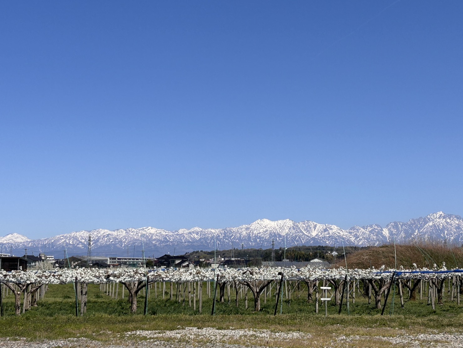 力強くそびえる立山連峰と、可憐に咲く梨の白い花。