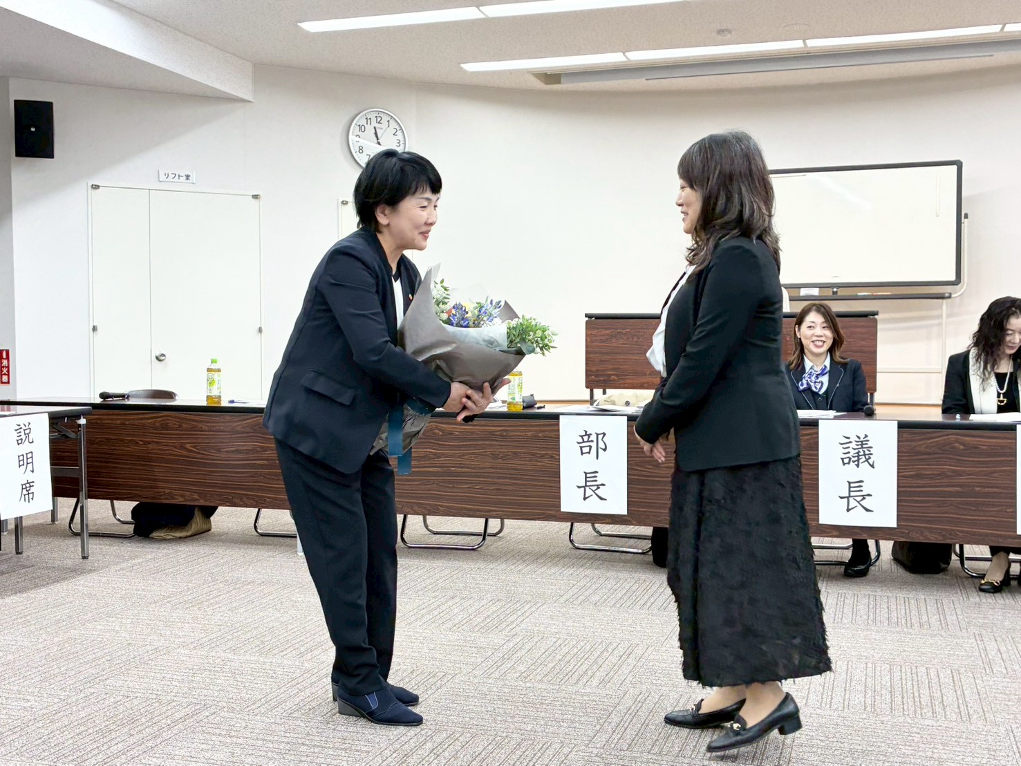また、新部長から旧部長へ感謝の気持ちを込めて花束の贈呈が行われ、会場は温かい拍手に包まれました。